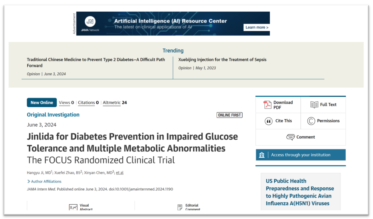 美國當?shù)貢r間2024年6月3日,以嶺藥業(yè)生產(chǎn)的創(chuàng)新中藥津力達顆粒循證研究論文《津力達對糖耐量異常合并多代謝紊亂人群的糖尿病預防效果——FOCUS隨機臨床試驗》在國際權威醫(yī)學期刊《美國醫(yī)學會雜志·內科學》(JAMA Internal Medicine,影響因子39)發(fā)表。論文介紹了津力達干預代謝綜合征糖耐量異常人群取得的重大成果——津力達可降低糖耐量異常合并多代謝紊亂人群罹患糖尿病的風險,為糖尿病的預防提供了新的視角和策略。