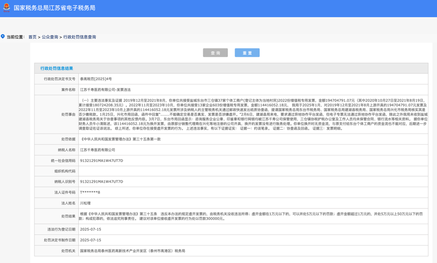 《中國經(jīng)營報》記者查詢國家稅務總局江蘇省電子稅務局、信用中國等網(wǎng)站發(fā)現(xiàn),7月15日,國家稅務總局泰州醫(yī)藥高新技術(shù)產(chǎn)業(yè)開發(fā)區(qū)(泰州市高港區(qū))稅務局對江蘇千壽醫(yī)藥發(fā)票違法行為進行行政處罰,處罰金額為30萬元。