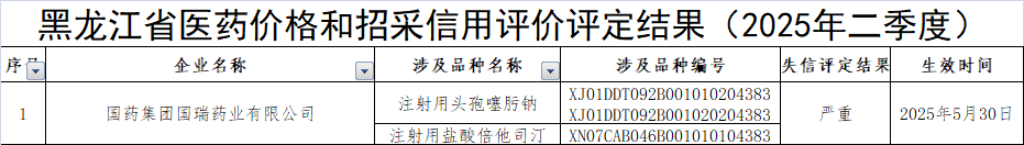 中國經(jīng)濟網(wǎng)北京8月5日訊(記者 郭文培)日前,黑龍江省公共資源交易中心發(fā)布《黑龍江省醫(yī)藥價格和招采信用評價評定結(jié)果的公示(2025年二季度)》。該中心對醫(yī)藥價格和招采失信事項目錄清單內(nèi)有悖誠實信用的行為開展了信用等級評定,國藥集團國瑞藥業(yè)有限公司被評為“嚴(yán)重失信”。
