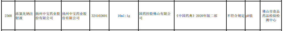 通告顯示,經(jīng)佛山市食品藥品檢驗檢測中心檢驗,揚州中寶藥業(yè)股份有限公司生產(chǎn)的濃氯化鈉注射液(批號:324102601)不符合規(guī)定,不合格項目為PH值。