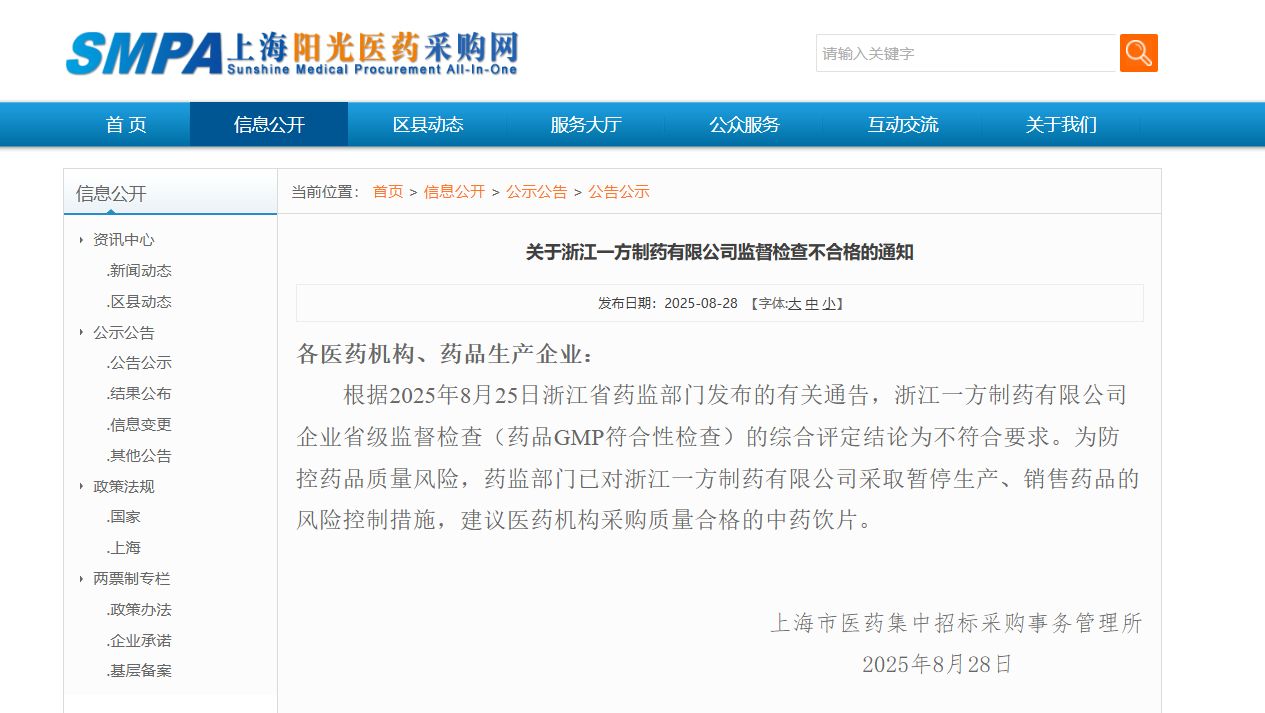 通知顯示,上海市醫(yī)藥集中招標(biāo)采購事務(wù)管理所提示各醫(yī)藥機構(gòu)、藥品生產(chǎn)企業(yè):根據(jù)2025年8月25日浙江省藥監(jiān)部門發(fā)布的有關(guān)通告,浙江一方制藥有限公司企業(yè)省級監(jiān)督檢查(藥品GMP符合性檢查)的綜合評定結(jié)論為不符合要求。為防控藥品質(zhì)量風(fēng)險,藥監(jiān)部門已對浙江一方制藥有限公司采取暫停生產(chǎn)、銷售藥品的風(fēng)險控制措施,建議醫(yī)藥機構(gòu)采購質(zhì)量合格的中藥飲片。