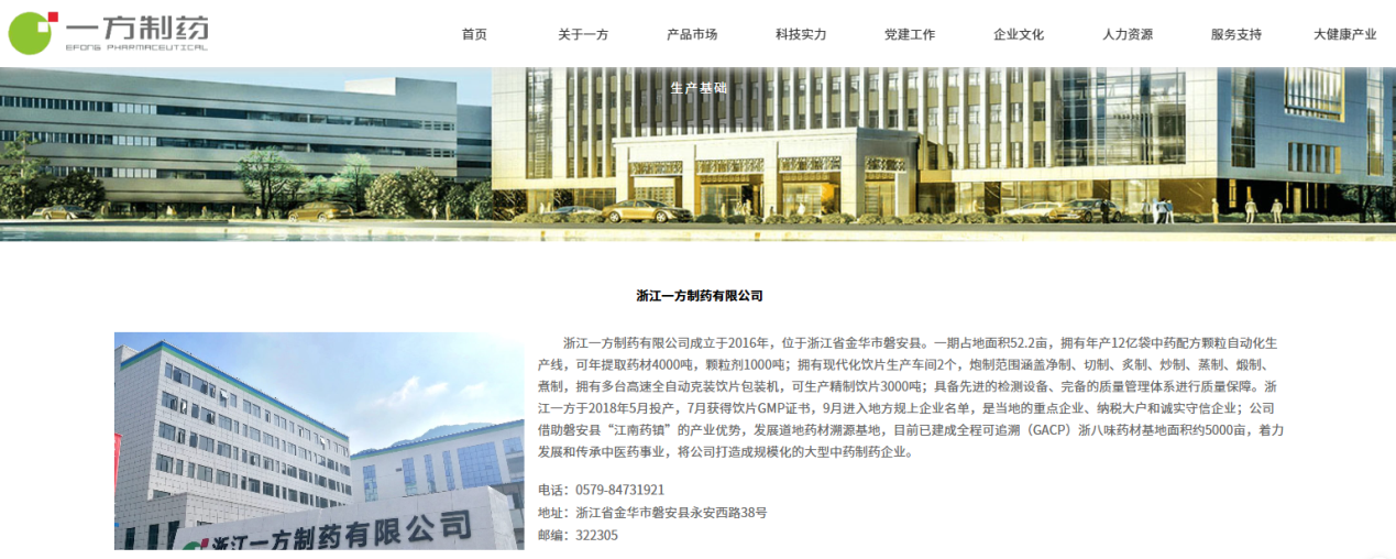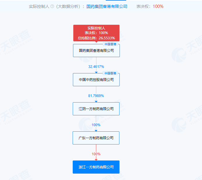 一方制藥官網(wǎng)介紹,浙江一方制藥有限公司成立于2016年,位于浙江省金華市磐安縣,公司于2018年5月投產(chǎn),7月獲得飲片GMP證書,9月進(jìn)入地方規(guī)上企業(yè)名單,是當(dāng)?shù)氐闹攸c企業(yè)、納稅大戶和誠實守信企業(yè)。天眼查顯示,國藥集團香港有限公司為浙江一方制藥有限公司實控人。