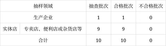 本次任務(wù)共10批次,實際抽到10批次,在生產(chǎn)企業(yè)和實體店中抽取,具體情況見表1。