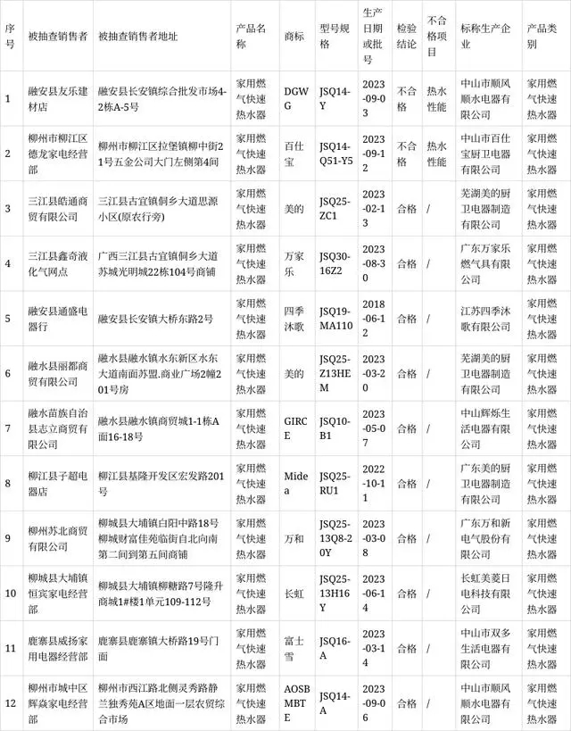 其中,2023年共抽查12家銷售者的12批次家用燃?xì)饪焖贌崴鳟a(chǎn)品,檢驗結(jié)果不合格2批次,不合格檢出率為16.67%。重點對產(chǎn)品的安全裝置結(jié)構(gòu)要求、燃?xì)庀到y(tǒng)氣密性、燃燒工況、熱水性能、表面溫升、銘牌等6個項目進(jìn)行檢驗,不合格項目涉及熱水性能。