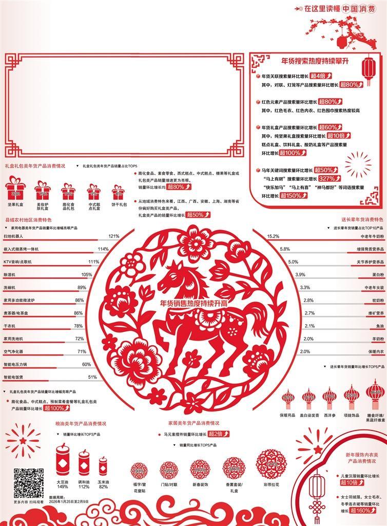 當(dāng)前,年貨消費呈現(xiàn)出“新舊融合、多元拓展”的顯著特征。一方面,承載吉祥寓意的“好彩頭年貨”持續(xù)走熱。其中,紅色元素全面滲透年貨消費場景,在最受消費者喜愛的紅元素年貨品類中,窗花、福字、燈籠、中國結(jié)等傳統(tǒng)裝飾產(chǎn)品持續(xù)熱銷,成為打造家庭年味氛圍的首選。同時,“馬年”關(guān)鍵詞搜索量環(huán)比大幅增長,生肖酒、對聯(lián)、玩偶、抱枕等產(chǎn)品的搜索量環(huán)比增幅均超過80%。各類搭配馬年吉祥祝福的產(chǎn)品熱銷,在“龍馬精神”“馬上有?!薄耙获R當(dāng)先”等祝福語加持下,不少馬年禮盒類產(chǎn)品受到消費者歡迎。