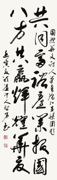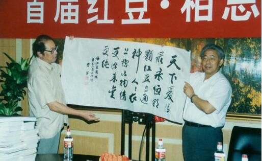在《七夕,紅豆最相思的詩意探訪》論壇主題引導(dǎo)下,詩人們暢談紅豆愛情詩的淵源,以及對中國新詩的助推、發(fā)展的歷史作用,使中華文化傳統(tǒng)薪火相傳,在我們這一代詩人手里發(fā)揚(yáng)光大,繪出獨(dú)特的、現(xiàn)代人審美的愛情詩篇。會(huì)上,北京電視臺(tái)節(jié)目主持人、詩人黃殿琴朗誦了張?jiān)妱?、桂興華、綠島寫的紅豆愛情詩歌,并展示了多位詩人等為紅豆集團(tuán)寫的多幅書法,表達(dá)了友誼深情?!肮餐辉.a(chǎn)業(yè)報(bào)國 八方共贏輝煌華夏”是詩人黎勇先生寫給紅豆集團(tuán)的書法 ,國際華文詩人筆會(huì)主席張?jiān)妱懡o紅豆集團(tuán)書法為“紅豆最相思”等。