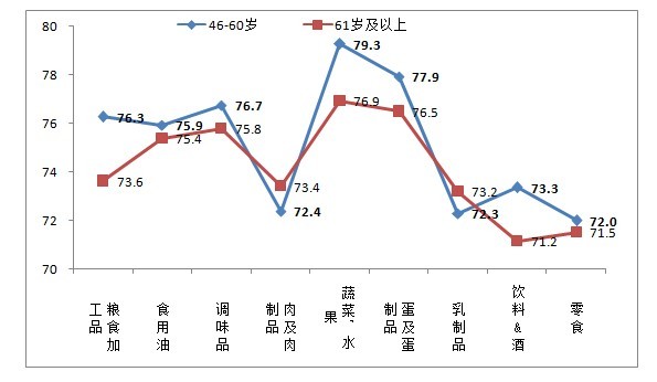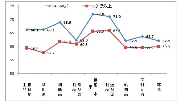 進一步分析46歲以上市民對食品安全現(xiàn)狀擔憂的食品領域,46-60歲市民對肉及肉制品、乳制品、飲料&酒和零食的安全信心指數(shù)評價較低,直接拉低他們目前對食品安全的放心程度。61歲以上市民目前對九大類食品的安全信心指數(shù)都偏低,除蔬菜水果和蛋及蛋制品外,其它食品的信心指數(shù)都低于65。