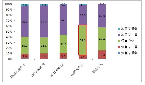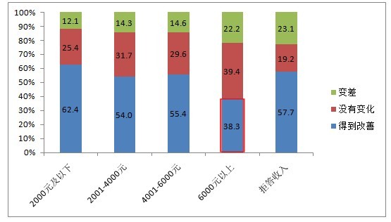 收入水平在6000元以上的市民,認(rèn)為過(guò)去一年食品安全沒(méi)有改善的人數(shù)遠(yuǎn)大于認(rèn)為有所改善的人數(shù)!