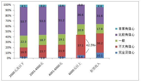 隨著人們收入水平的提高,大家對(duì)于食品安全越發(fā)沒(méi)有信心,數(shù)據(jù)顯示,除了拒絕透露收入水平的人群外,6000元以上的高收入人群對(duì)現(xiàn)狀沒(méi)有信心的比例最高,超四成。