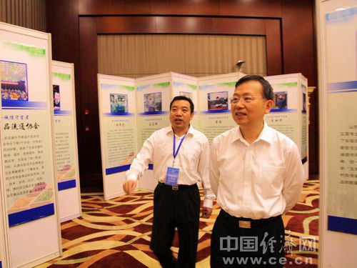 2013年全國食品安全宣傳周啟動儀式暨第五屆中國食品安全論壇6月17日在北京舉辦,今年主題為“社會共治 同心攜手維護(hù)食品安全”。圖為公安部副部長黃明(右)參觀食品安全“誠信守望者”展覽。中國經(jīng)濟(jì)網(wǎng) 王耀峰/攝